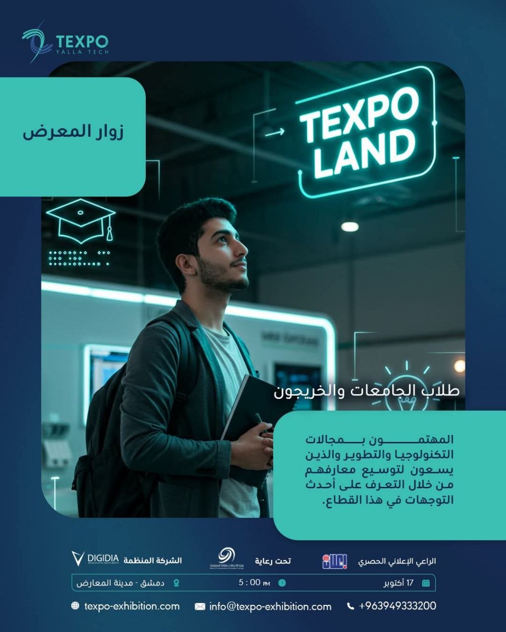 يأتي معرض TEXPO LAND في مرحلة استثنائية تشهدها سوريا، حيث تستعد لدخول مرحلة التحول الرقمي والانفتاح على العالم بعد فترة من الانقطاع الطويل.